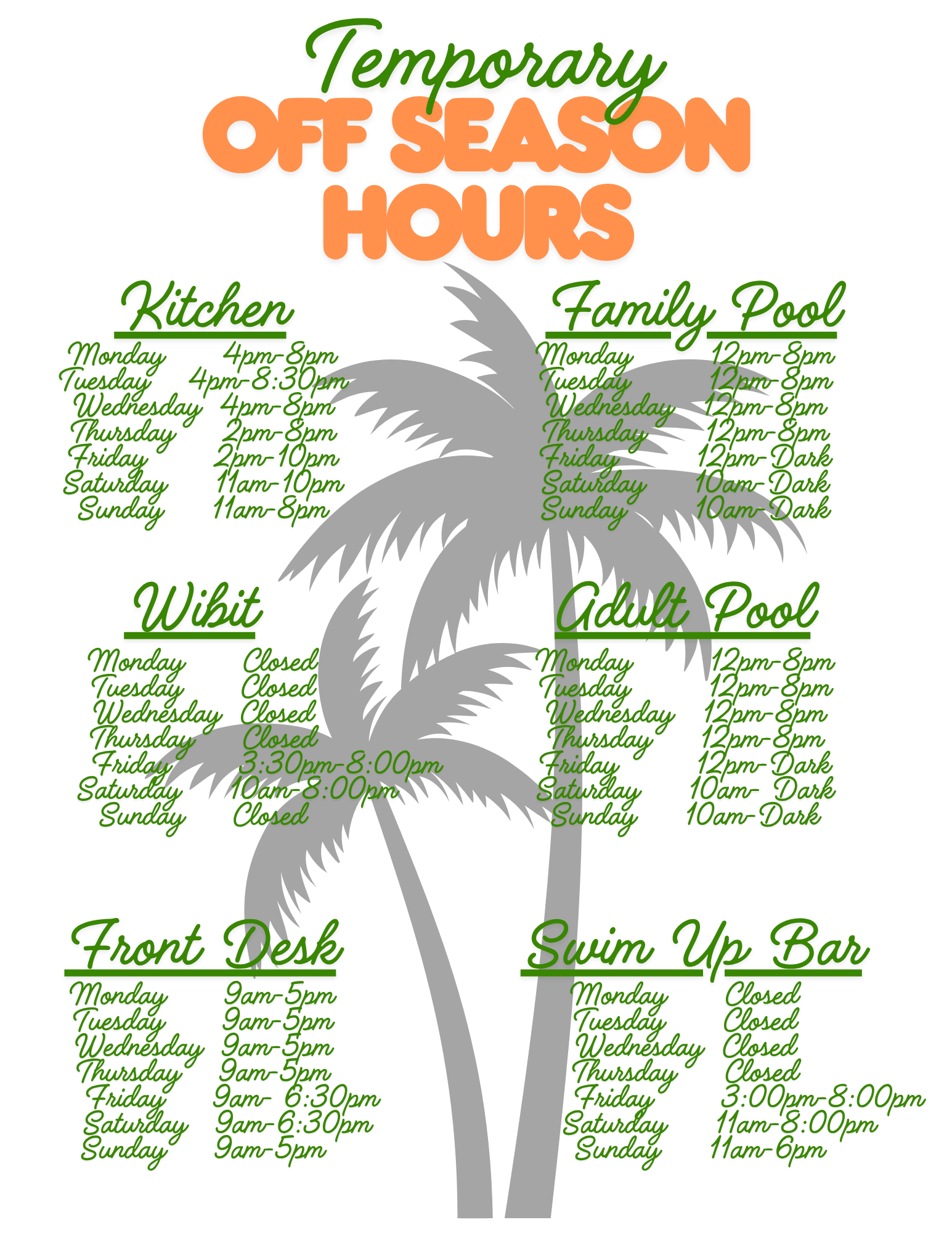 - 20 total poolside cabanas for rent (10 at the family pool, 10 at the adults-only pool).